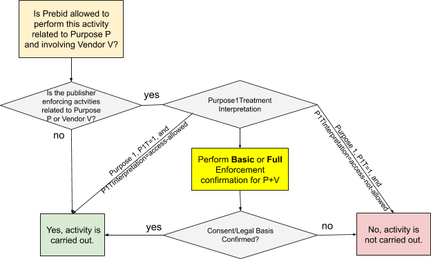 Prebid offers publishers several controls for whether consent/legal basis confirmation is even performed. The following flowchart shows how the controls